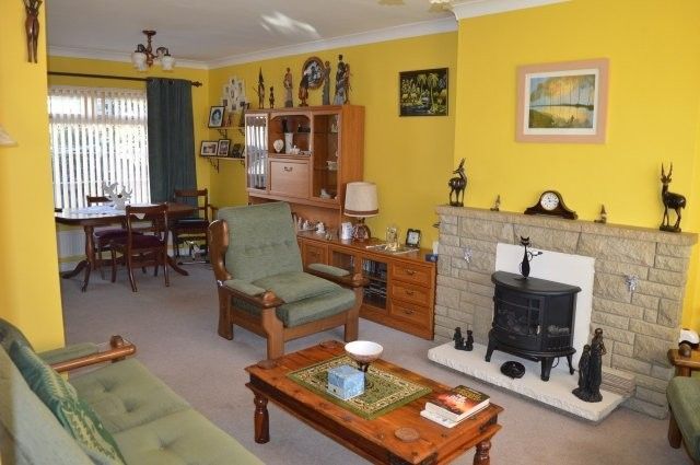 LOUNGE/DINING ROOM 7m x 3.6m Upvc window overlooking the front with vertical blinds and a radiator beneath. Carpet cover. Various power points. Tv Point. Wired for two ceiling lights. Plain plastered ceiling with coving. Conglomerate stone fireplace and hearth.