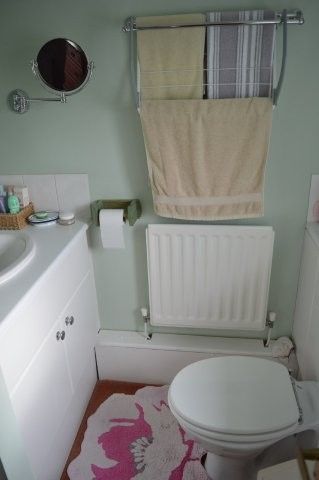 CLOAKROOM/WC Fitted with a low-level w/c and wash hand basin in white with ceramic tiled splashback. Wired for ceiling light. Panel radiator. Woodblock flooring. Extractor fan.