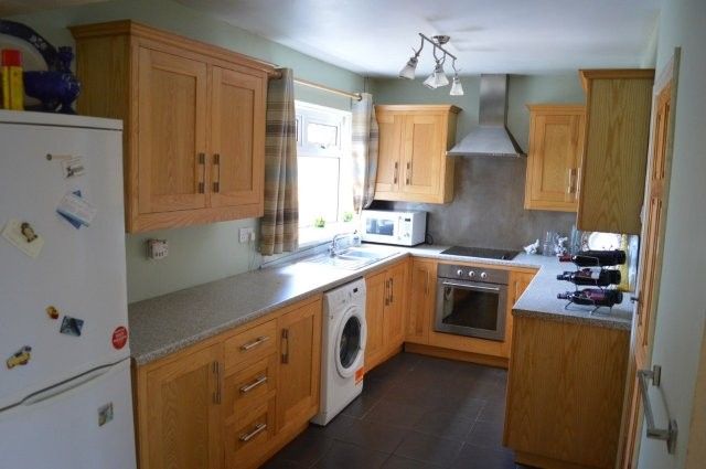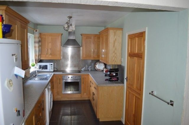 KITCHEN/BREAKFAST ROOM 6m x 2m 20cm Galley style kitchen. Matching wall and base units with an aluminium splashback surround. Upvc window overlooking the rear. Power points. Tiled floor. Sink unit with a mixer tap. Plain plastered ceiling with spotlights. Plumbing for appliances. Ceramic hob with an oven and a n extractor fan over. To the breakfast area: laminate flooring. Power points. Single panel radiator with an individual thermostat. Centre light. Archway leading to the dining room.