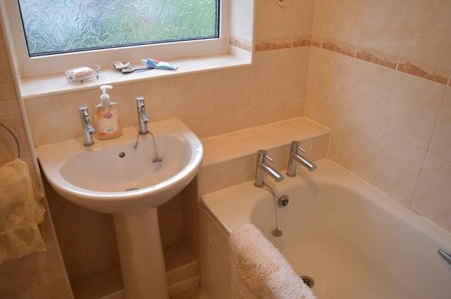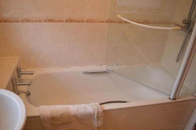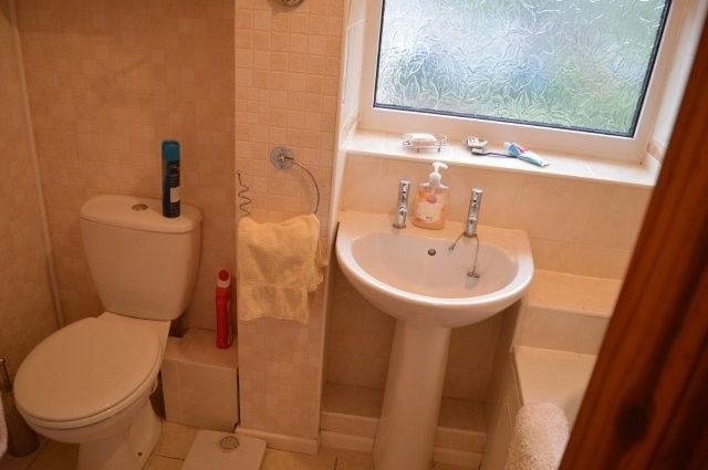 FAMILY BATHROOM Suite in white comprising of a panel bath with shower over and screen, wash hand basin and w/c. Medicine cabinet. Radiator to one wall. Obscure glazed window to the side. Tiled flooring. Tiling to the shower area.