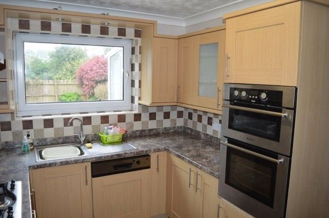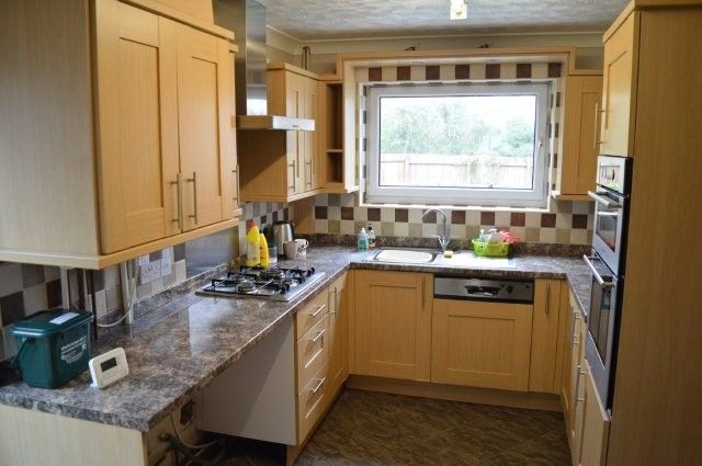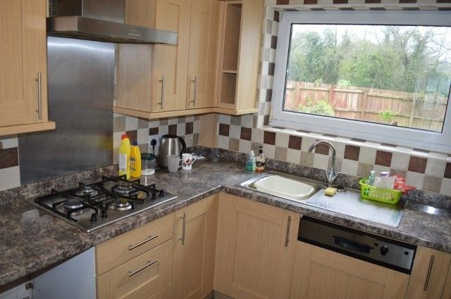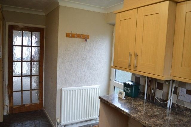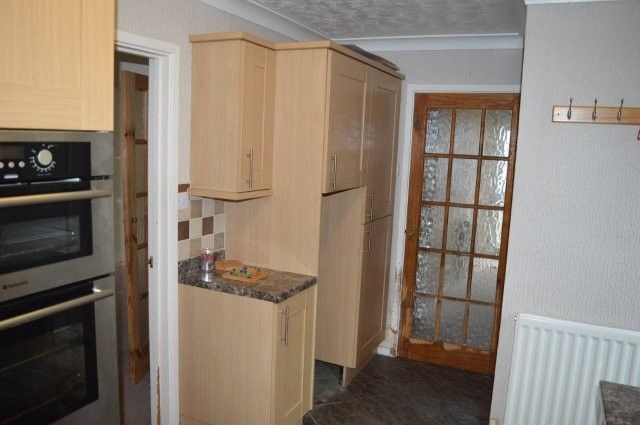 Fitted kitchen with matching base and wall units. Window to the rear with a sink unit and mixer tap beneath. Splashback tiles. Hotpoint oven and grill. Gas hob with extractor fan over. Panel radiator. Obscure glazed rear door that leads to side of the property. Plumbing for appliances. Location of the gas fired combination boiler that serves the domestic heating and hot water system.