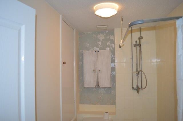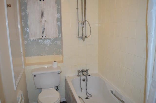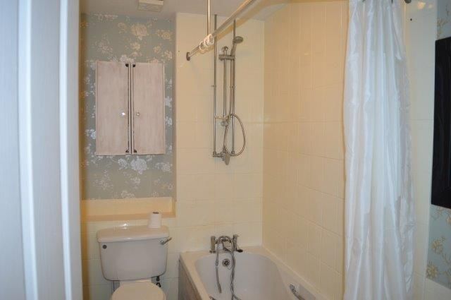 BATHROOM Fitted with a modern suite in white comprising low level w.c., wash hand basin, panelled bath and shower over. Ceramic tiled walls. Wired for ceiling light. Extractor fan. Vinyl cover flooring. Medicine cabinet. Single panel radiator. Situation of the former airing cupboard with shelving.
