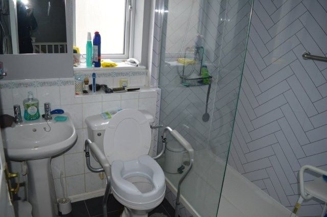 BATHROOM Bathroom suite comprising of a walk-in shower with a glass screen, w/c and wash hand basin. Upvc obscure glazed window overlooking the side with a blind. Radiator. Wired for lighting. Extractor fan. Shaving point. Vinyl flooring.
