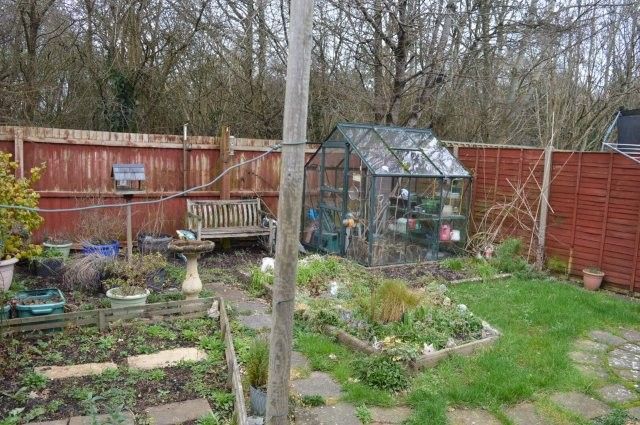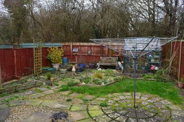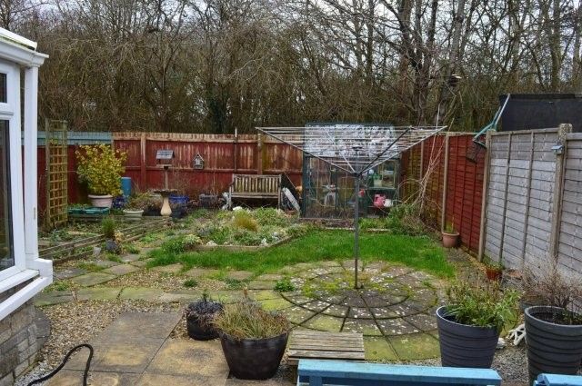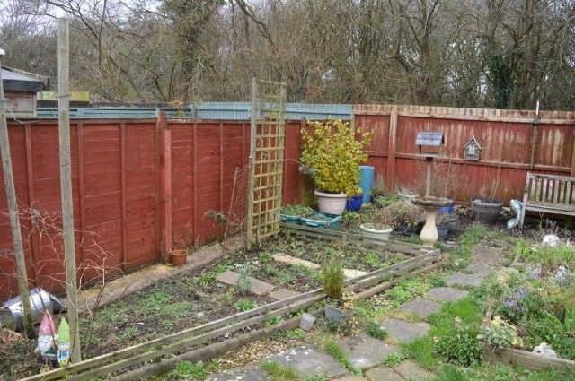 To the rear garden bordered by fencing with a lawned area and a patio area, a small vegetable patch and garden sheds. Greenhouse.