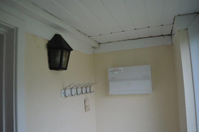 RECEPTION HALL Location of the utility meters. Lighting. Vinyl flooring. Coat hangers. Door to