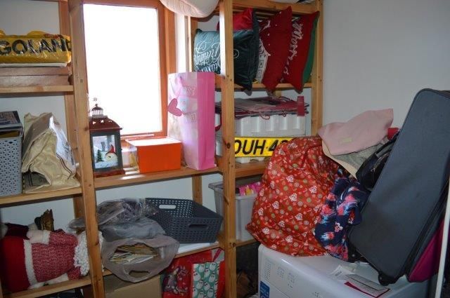 WALK IN WARDROBE 6’ 0” x 5’ 4” Obscure glazed window. Wired for sunken spotlights. Made to measure wooden shelving. Vinyl tile flooring.