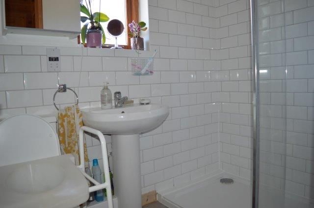 FAMILY BATHROOM 7’ 2” x 5’ 2” Obscure glazed window to the side. Wired for sunken spotlights and extractor fan. Modern bathroom suite in white comprising wash hand basin, WC and double shower. Ceramic tiling around the bath, shower area, wash hand basin and WC. Shaving point. Mirror. Fitted towel ring. Vinyl tile flooring.