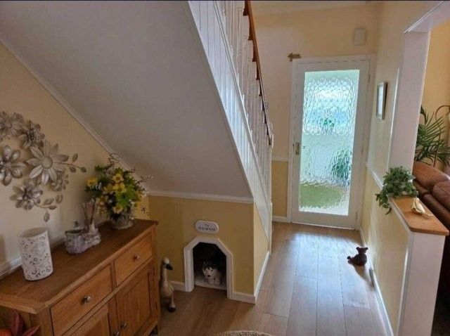 PORCH Laminate flooring. Coved and artex ceiling. Obscure glazed window. Power point. Radiator. Storage cupboard for coats and shoes. Location of the fuse board and (hard-wired) house alarm.