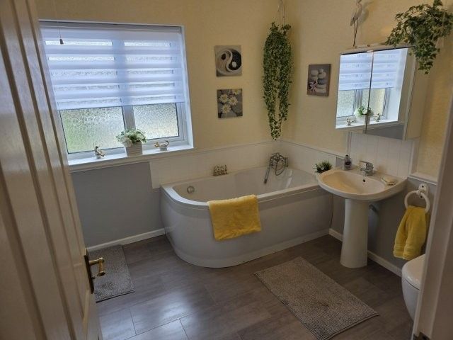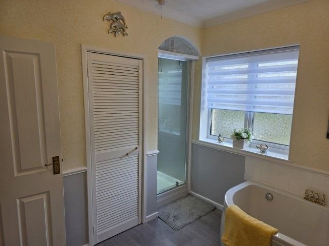 BATHROOM 3.3m x 2.7m Modern bathroom suite in white comprising of a corner bath with mixer/ shower tap, low level w/c and wash hand basin. Artex ceiling with coving. Centre light. Extractor fan. Airing cupboard with storage. Vanity cabinet with mirror and light. Built in shower cubicle. Vinyl flooring and underfloor heating.
