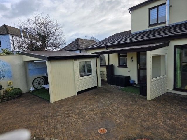 To the rear – brick pavier patio. Two gazebos (top and bottom of the garden), one summerhouse, one greenhouse, one small seat retreat and one shed. Mature gardens partly laid to lawn with shrubs, a vegetable patch and feature cooking apple tree. Water butts, compost bins, recycling storage, water laid on and outside light. Two stone benches.