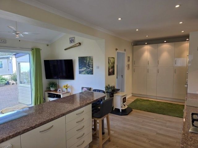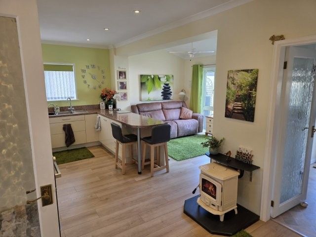 KITCHEN/GARDEN ROOM To the kitchen area 6.85m x 2.7m: luxury modern kitchen fitted with a range of base, wall and corner carousel units with matching work surfaces. Five double height storage/larder units and six additional under unit drawers. Plain plastered ceiling with coving and spotlights. Ceiling fan. Double radiator and further tall radiator. Breakfast bar with two seats. Various level power points. Laminate flooring. Two built in fridges and a built-in dishwasher. Stainless steel sink with taps including a boiling water tap. Window with venetian and roller blind overlooking the side. Hotpoint electric oven and gas hob. Built in microwave. To the garden room area 3.8m x 2.6m: feature Stanley multifuel fireplace for logs or smokeless coal. Power points and tv point. Radiator. Window overlooking the rear garden. Laminate flooring. Obscure glazed door leading to the utility room.