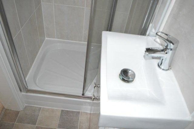BATHROOM 2.75m x 1.9m Modern suite in white comprising of a wash hand basin, w/c and double shower cubicle. Upright aluminium radiator. Tiled flooring. Two medicine cabinets. Obscure glazed window with roller blind.