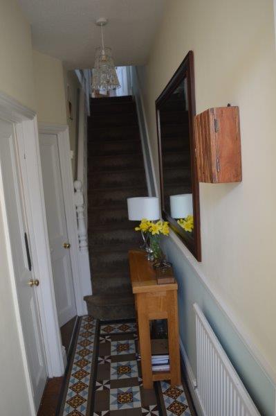 RECEPTION HALL Spacious hallway with staircase leading to the first floor. Wired for central light. Power points. Panel radiator to one wall. Doorbell. Situation of service meters. Original pattern tile floor.