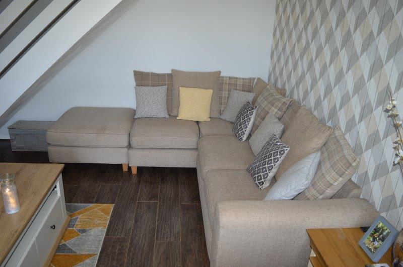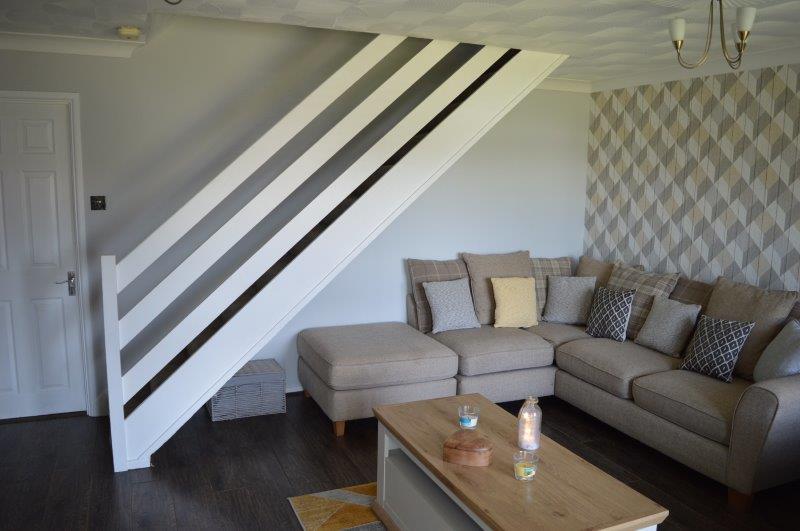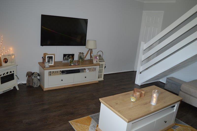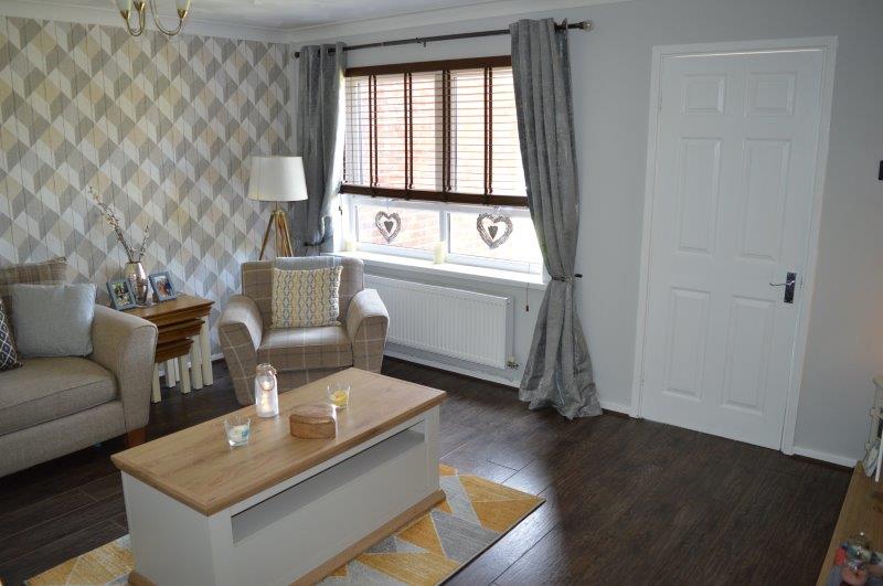 LIVING ROOM 4.49m x 4.23m Laminated flooring. Coved ceiling wired for lights. Smoke detector. UPVC windows with blinds to the front and double panel radiator beneath. Various power points and featured wallpapered wall. TV point. Carpeted staircase leading to the first floor with a further door leading into the kitchen/breakfast room.