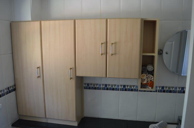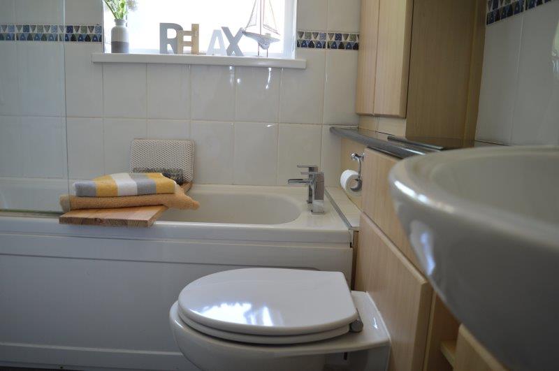BATHROOM Modern fitted bathroom with a suite in white comprising a panel bath with power shower over, wash-hand basin and WC. Vinyl flooring. Obscure window to the rear. Built in wooden vanity unit. Tiled to three walls. Location of the airing cupboard which houses the combination boiler which serves the domestic heating and hot water services.