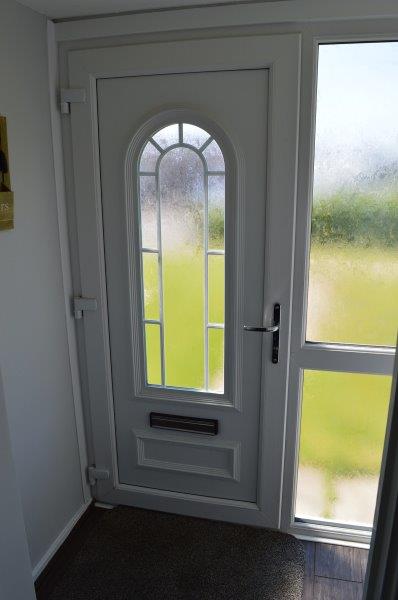 Approach to front porch via a UPVC glazed pattern inset door with side panel.