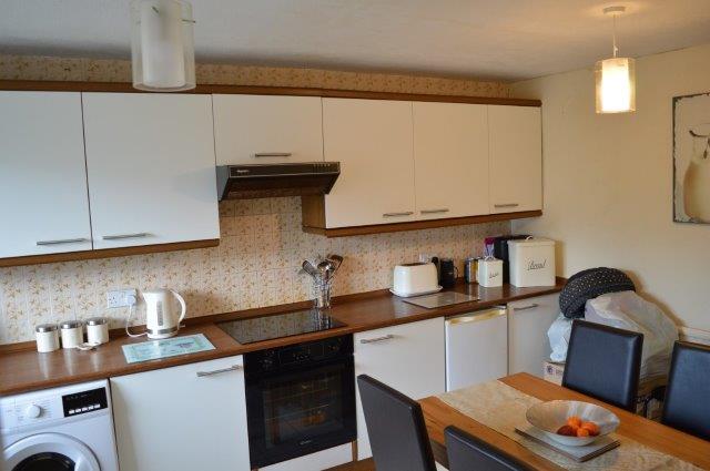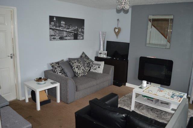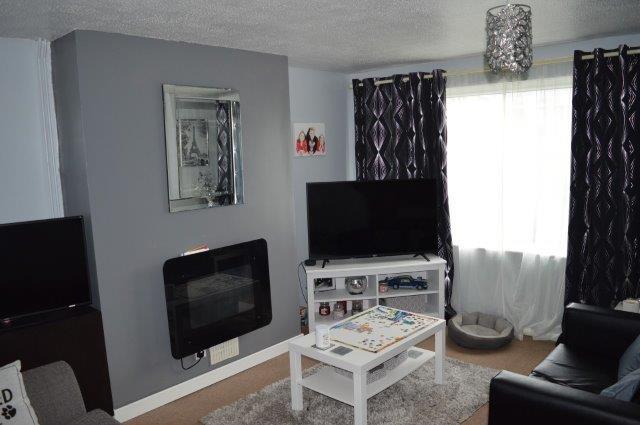 LOUNGE 15’6” x 13’3” (4.75m x 4.05m) UPVC Window with curtain poles and fixtures overlooking the front Wired for centre light and power points. TV point. Wall mounted electric fire. Carpet cover. Radiator to one wall.