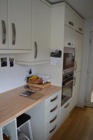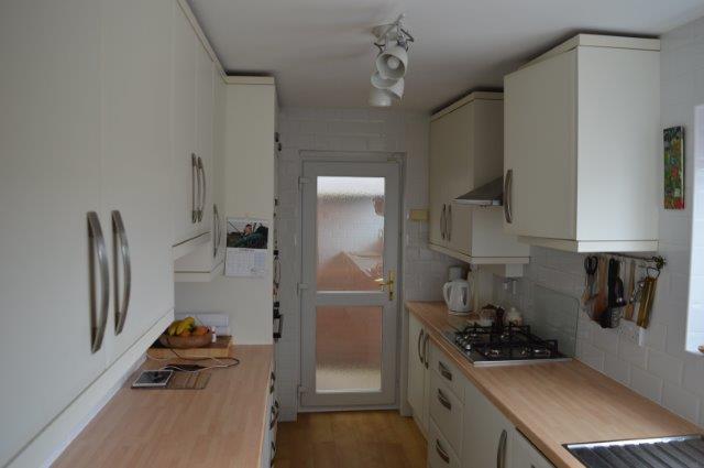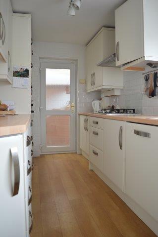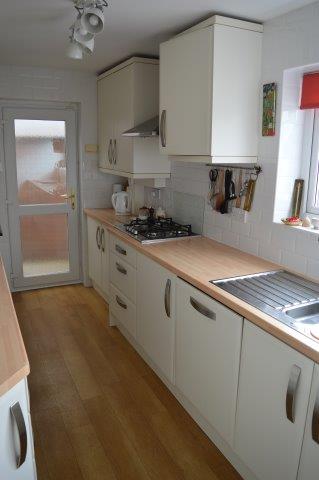 KITCHEN Galley style kitchen. Laminated flooring. Window with blind overlooking the rear garden with one and a half bowl drainer sink with mixer taps. Modern well-equipped kitchen fitted with a range of base and wall units with matching work surfaces and ceramic tiled walls. Plain plastered ceiling. Incorporating a four-ring gas hob with extractor hood over and oven/ grill. Built in microwave and fridge freezer. Wired for ceiling lights and power points. Location of the gas fired combination boiler which serves the domestic heating system. Half glazed door leads to the rear porchway and garage.