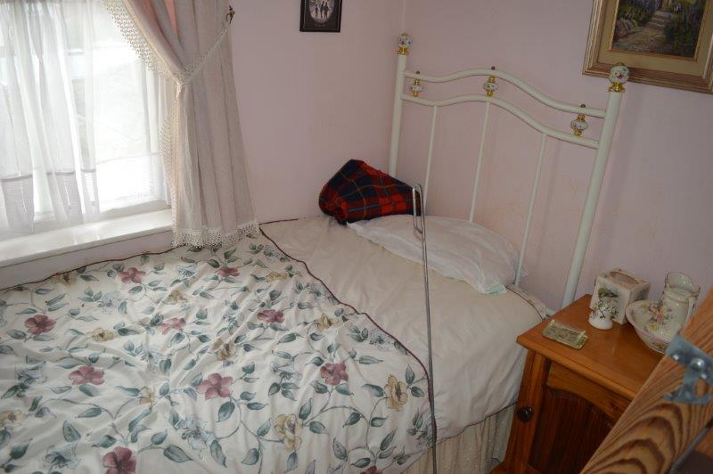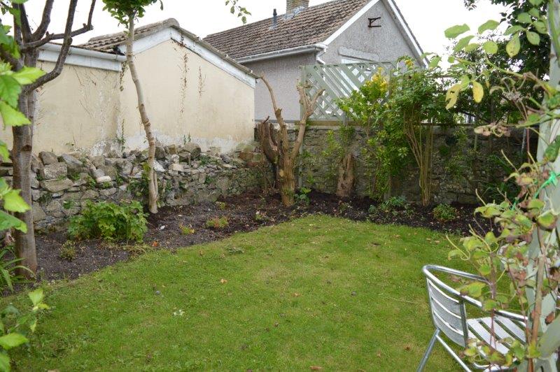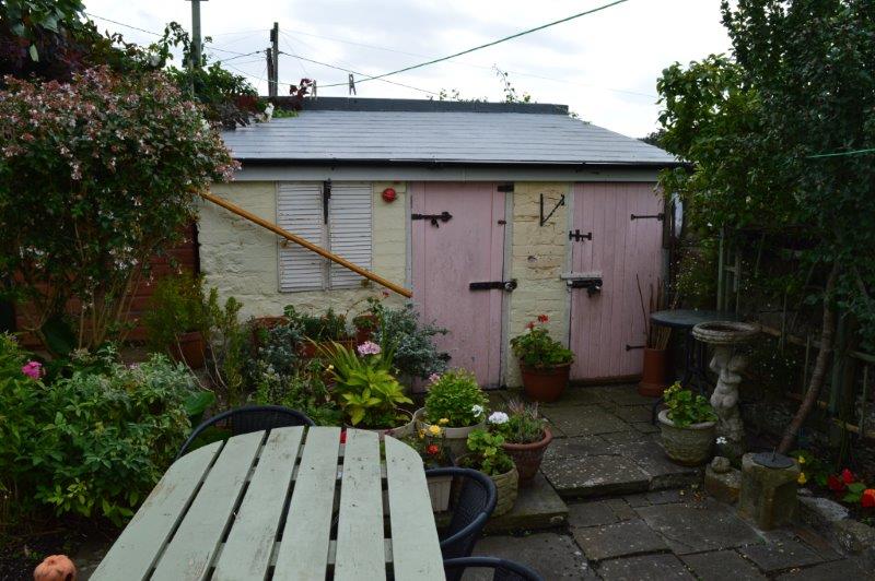 To the rear – flagstone courtyard area with beds of mature shrubs and plants. Outbuilding. Stone boundary wall. Water laid on. Wired for outdoor lights. Lawn area surrounded by beds with a good variety of mature shrubs.