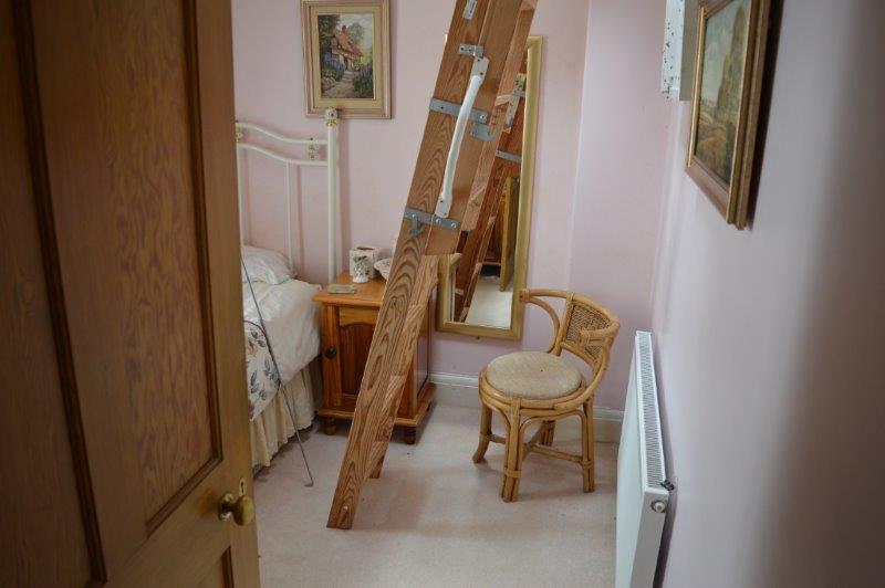 BEDROOM THREE 9’ 9” x 8’ 0” Window overlooking the rear. Panel radiator. Wired for centre light and power points. Carpet cover. Access into roof space via a pull down ladder.