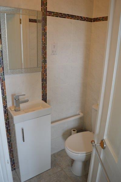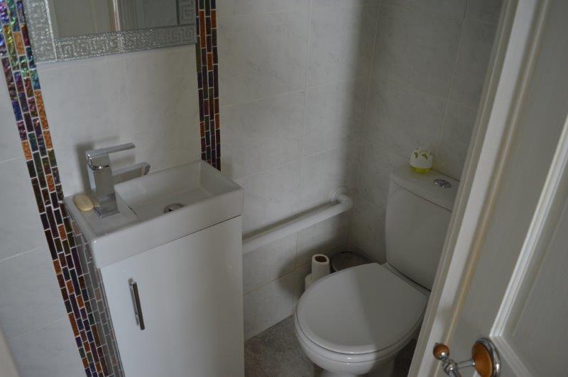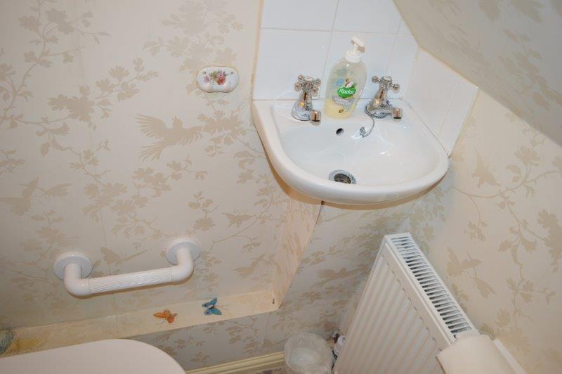 CLOAKROOM Suite in white comprising a wash hand basin with tiled surround and WC. Wired for light. Panel radiator. Ceramic tiled floor.