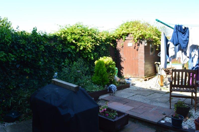 To the rear Bounded by fencing. Principally laid to patio and a seating area. Water laid on. Wired for outside light. Step leads up to further patio with chippings. Raised border plant beds. Shed. Access gate to a rear pathway overlooking the school playing fields.