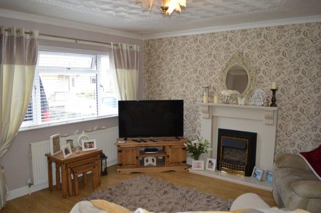 LOUNGE 4.47m x 4.14m Large picture window to the front with blinds and opening transoms and a panel radiator beneath. Combed artic ceiling and coved which is wired for centre lights. Adams style fireplace incorporating an electric fire independent of the heating system. Oak style laminated flooring. Power-points and VHF points. Living room leads to the dining room.