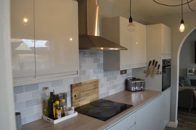 KITCHEN 3.2m x 2.7m Modern kitchen fitted with a range of base and wall units with matching work surfaces with a one and a half bowl sink. Split level oven and hobs. Tiled with built-in dishwasher and fridge. Off the kitchen there is a rear hallway with a half glazed door leading to the rear garden.