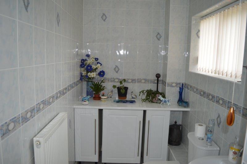 CLOAKROOM Window with vertical blinds overlooking the front. Wired for centre light. Suite in white comprising a wash hand basin and W/C. Fitted vanity cupboards with matching surface over. Double panel radiator. Access to roof space. Fully tiled floor and walls.
