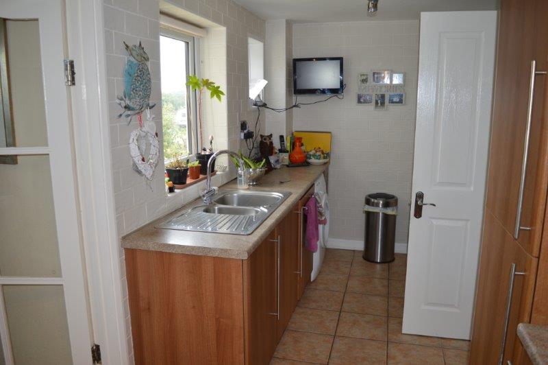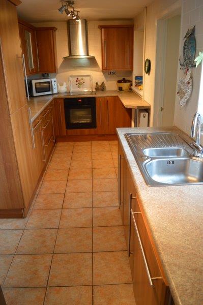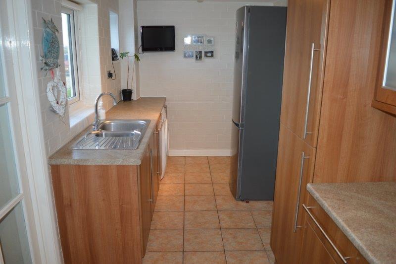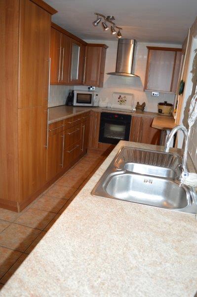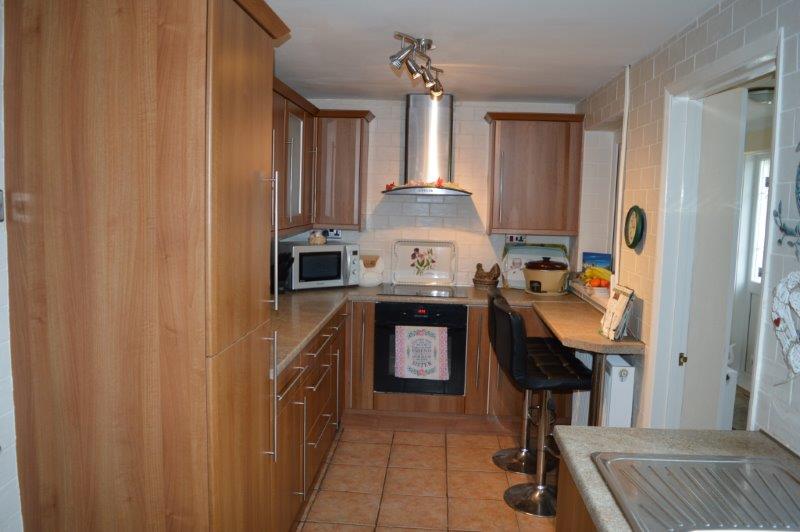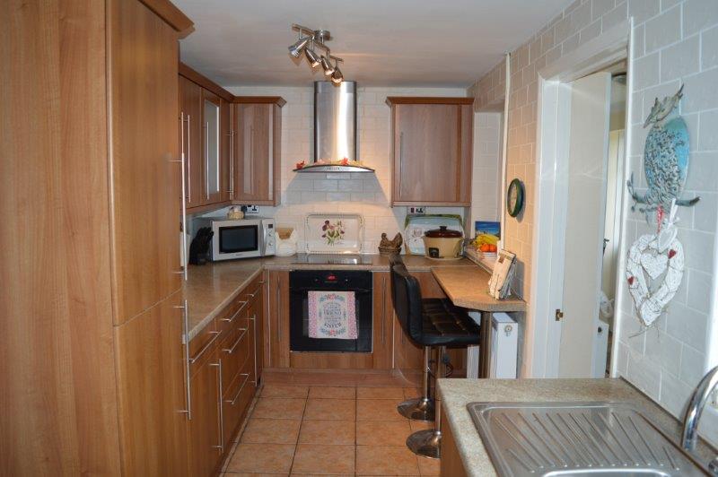 KITCHEN/BREAKFAST ROOM Two windows with roller blinds overlooking front. One and half bowl single drainer sink with mixer taps beneath. Window overlooking hall. Wired for ceiling lights and power points. Fitted kitchen with an excellent range of base and wall units with a breakfast bar and matching work surfaces over. Incorporated in the units is a ceramic hob, oven and extractor hood. Plumbing for appliances. Double panel radiator. Ceramic tiled walls and floor. Under stairs storage cupboard.