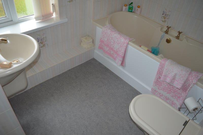 FAMILY BATHROOM Obscure glazed window with blinds. Wired for light. Suite comprising panel bath, wash hand basin and W/C. Ceramic tiled walls. Panel radiator. Vinyl tile flooring.