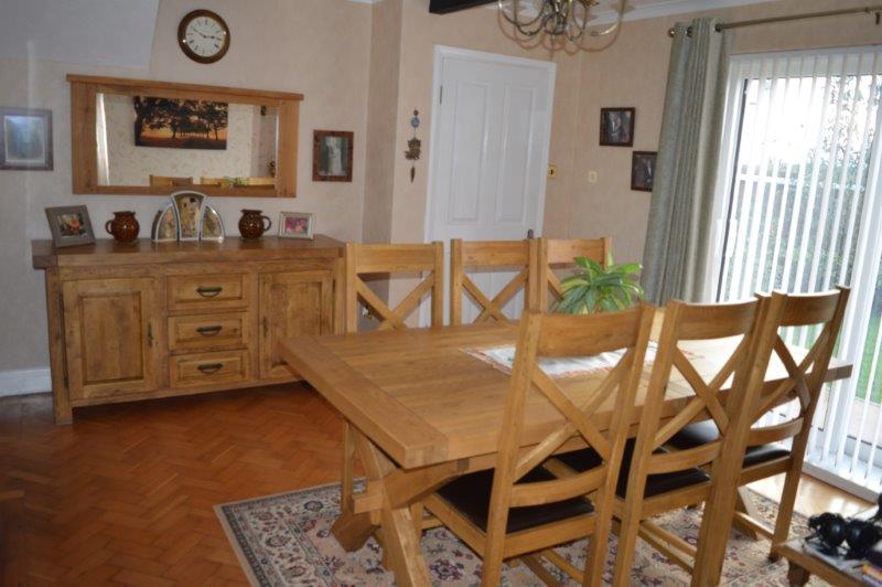 DINING ROOM 4.25m x 3.80m maximum. Beamed ceiling. Wired for centre light and power points. French doors with vertical blinds to the rear garden. Radiator with individual thermostat. Wood flooring.