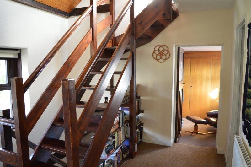 Dog leg staircase with fitted carpet to first floor. Exposed timber beam.