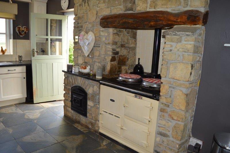 KITCHEN/DINING ROOM 20’ 5” x 19’ 6” Windows to the side and rear. Plain plastered ceiling with timber and painted beams. Exposed stonework. Wired for spot lights. Range of base and wall units with matching work surfaces over and a one and a half bowl sink with mixer tap. Two oven Aga. Range of power points. Plumbing for appliance. Half glazed stable door to the side. Dining area: double French doors overlooking the garden. Panel radiator to one wall. Stone tiled floor.